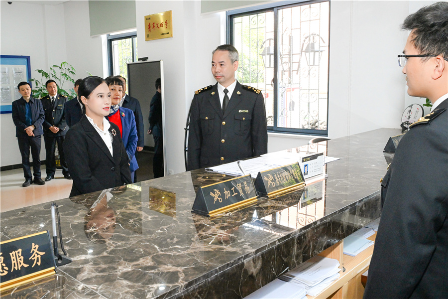 (10月28日下午,市委副書記、代市長(zhǎng)韋朝暉在懷化海關(guān)、市商務(wù)局調(diào)研。圖為韋朝暉在懷化海關(guān)報(bào)關(guān)窗口詳細(xì)了解進(jìn)出口貨物通關(guān)報(bào)關(guān)等情況。懷化日?qǐng)?bào)全媒體記者 潘雨 攝)