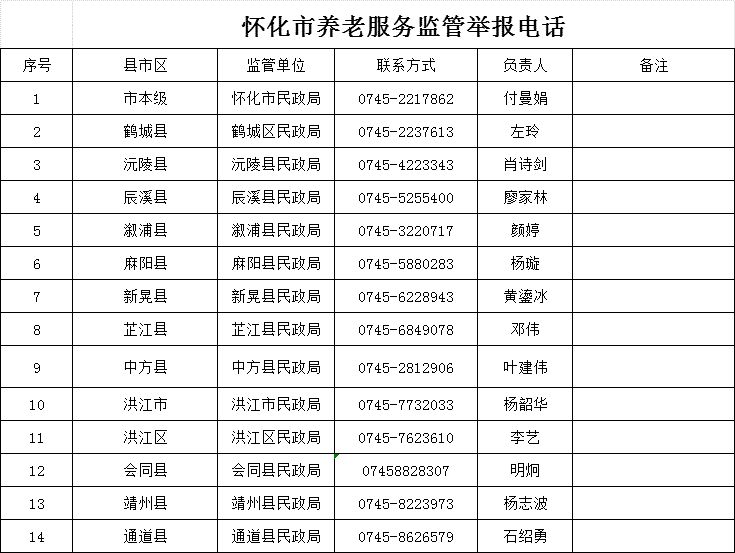 為響應(yīng)社會為老服務(wù)需求,提升養(yǎng)老服務(wù)質(zhì)量,加強(qiáng)對養(yǎng)老機(jī)構(gòu)和養(yǎng)老從業(yè)人員的監(jiān)督,回應(yīng)民眾關(guān)切,推動養(yǎng)老事業(yè)和養(yǎng)老產(chǎn)業(yè)協(xié)同健康發(fā)展,經(jīng)市縣民政部門確認(rèn),現(xiàn)將懷化市縣兩級養(yǎng)老服務(wù)熱線和監(jiān)管舉報電話,在懷化轄區(qū)內(nèi)依法辦理法人登記并在民政部門備案且通過消防審驗的養(yǎng)老機(jī)構(gòu)名單予以公布并接受社會各界的監(jiān)督。